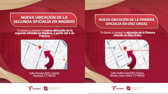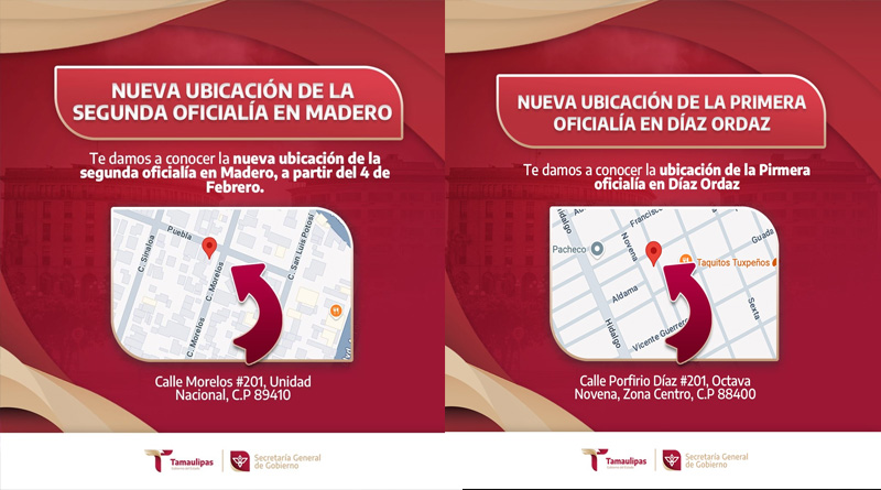 El funcionario explicó que, la nueva ubicación de la Oficialía Segunda de Registro Civil en Ciudad Madero, será en Calle Morelos #201, Colonia Unidad Nacional, en Ciudad Madero. El servicio en esta nueva dirección comenzará a partir del 4 de febrero de 2025.