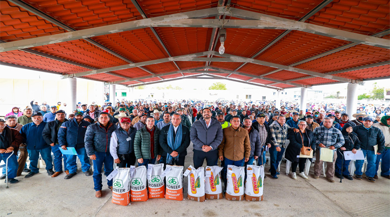 Más de 46,700 litros de diésel y más de 2,500 sacos de semilla de sorgo Pionner y Dekalb apoyarán la producción de los agricultores de esta ciudad, como lo confirmó el Subsecretario Camacho Nieto, quien trajo también un mensaje del Gobernador Constitucional de Tamaulipas.