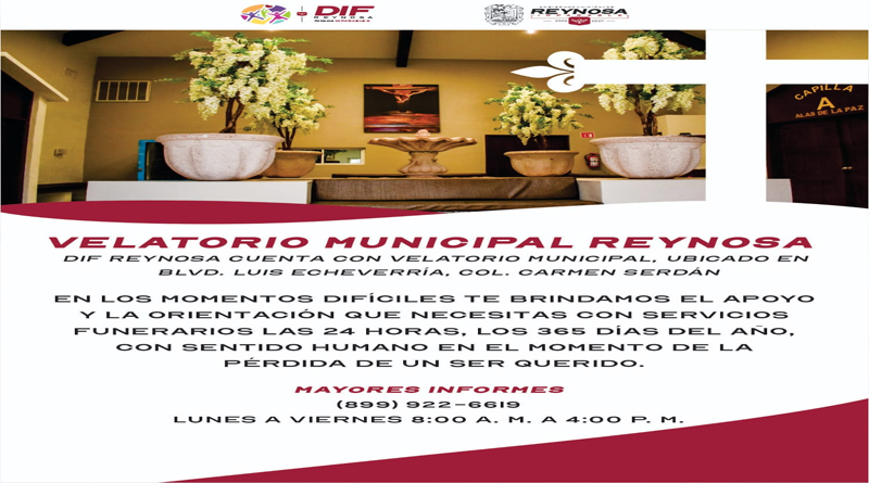 El Gobierno de Reynosa que encabeza el Alcalde, Carlos Peña Ortiz, a través del Sistema DIF Municipal, atiende a las familias que más lo necesitan en el Velatorio Municipal, las 24 horas, los 365 días del año.