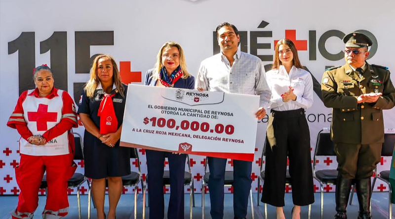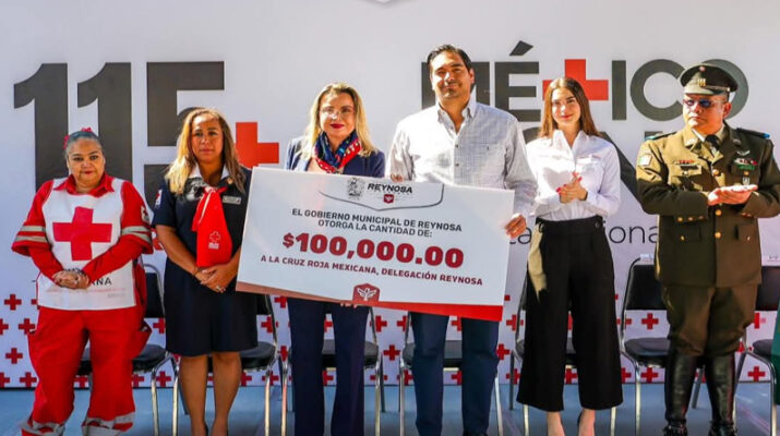 El Presidente Municipal Carlos Peña Ortiz, acompañado por Alejandra Yelitza Garza, Presidenta del Voluntariado DIF-Reynosa, entregó un donativo del Gobierno de Reynosa por 100,000.00 Pesos a la Presidenta del Patronato de la Cruz Roja Mexicana, Delegación local, Lizbeth Dinora García Dueñas, dando el arranque a la Colecta Nacional 2025 «México Dona», este martes 25 de febrero.