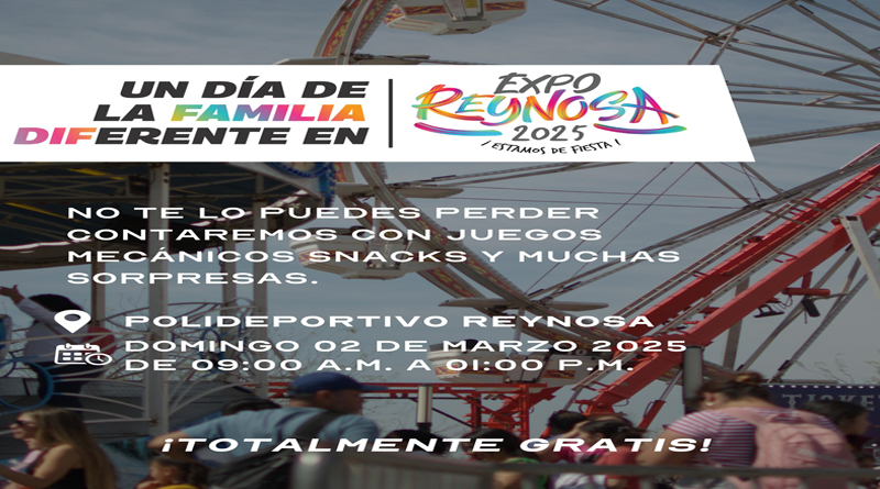 El Gobierno de Reynosa que encabeza el Alcalde, Carlos Peña Ortiz, a través del Sistema DIF Reynosa, invita a participar en el Día de la Familia 2025, hoy domingo 02 de marzo, de 9:00 de la mañana a 1:00 de la tarde, con entrada completamente gratuita.