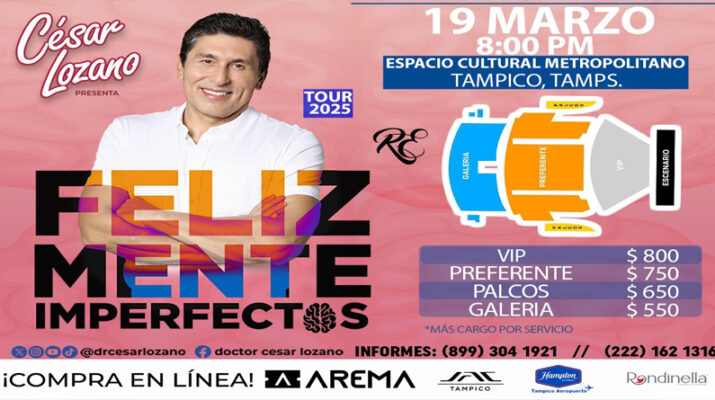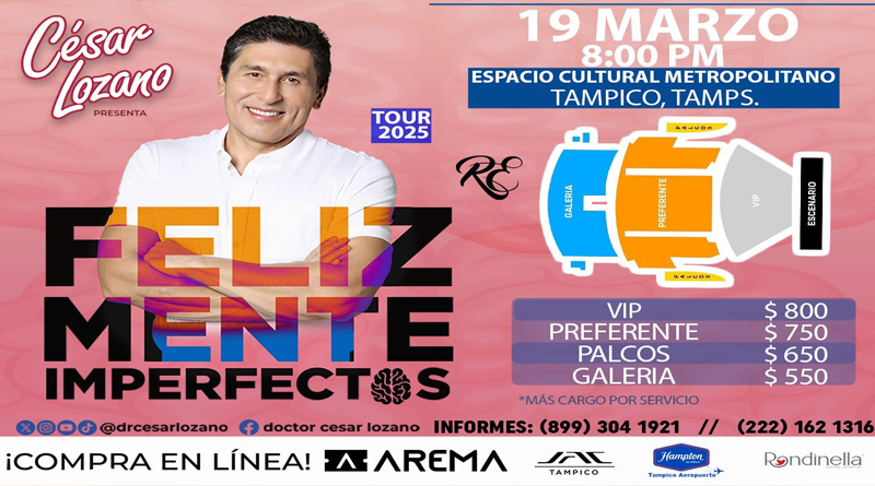 Ciudad Victoria, Tamaulipas.- El reconocido conferencista César Lozano estará presentándose en el sur de la entidad con su ponencia “Feliz Mente Imperfectos”, evento del que una parte de las ganancias obtenidas, serán destinadas a los diferentes programas asistenciales del Sistema DIF Tamaulipas que es presidido por la doctora María de Villarreal.