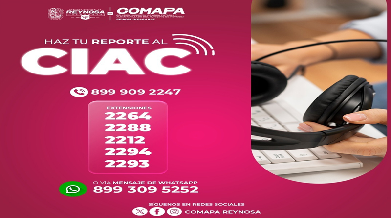 Reynosa, Tamaulipas.- Con el firme compromiso de mejorar los servicios de agua potable y drenaje sanitario, la Comisión Municipal de Agua Potable y Alcantarillado de Reynosa, pone a disposición de los usuarios el Centro Integral de Atención Ciudadana (CIAC), un canal de comunicación directo para la recepción y atención de reportes sobre incidencias en el suministro de agua y en la infraestructura sanitaria.