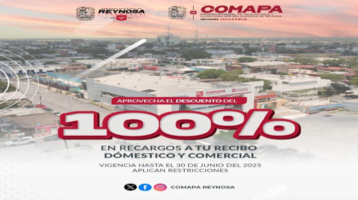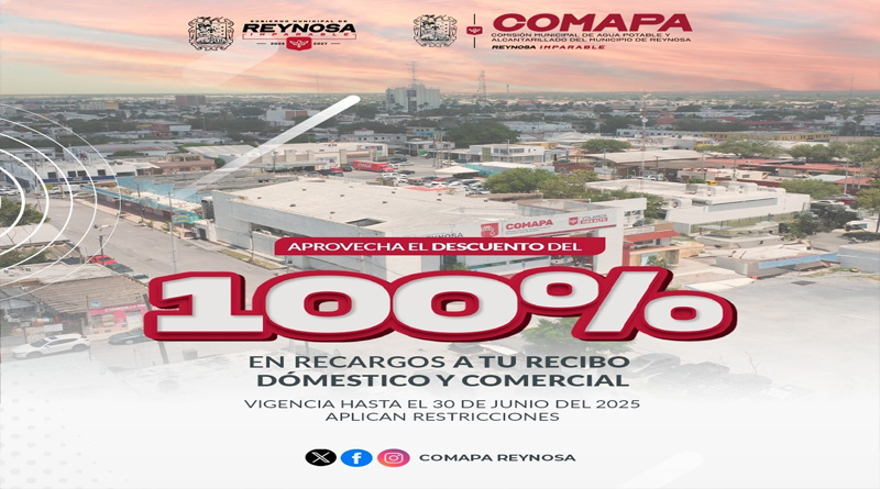 La Comisión Municipal de Agua Potable y Alcantarillado de Reynosa invita a todos los usuarios de uso doméstico y comercial a aprovechar el beneficio del 100% de descuento en recargos por adeudo, realizando su pago en una sola exhibición.
