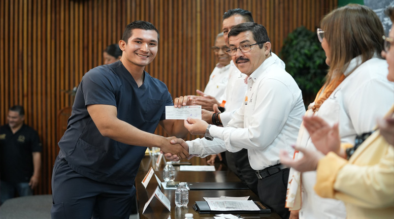 El rector Dámaso Anaya Alvarado presidió la ceremonia de entrega de estímulos económicos a hijas e hijos del personal docente que se han destacado como estudiantes de excelencia en la Universidad Autónoma de Tamaulipas, así como la firma del contrato colectivo laboral 2025 con el Sindicato Único de Trabajadores Académicos de la UAT (SUTAUAT).