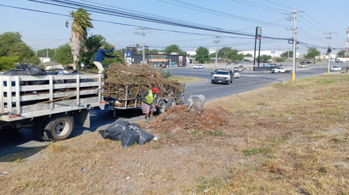 Tras finalizar con el corte de hierba y limpieza general del acceso al parque industrial Del Norte, la Dirección de Parques y Jardines del Municipio procedió a recolectar la maleza en el sitio.
