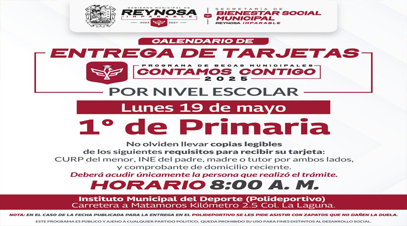 Este lunes 19 de mayo, el Presidente Carlos Peña Ortiz entregará las Becas Municipales Contamos Contigo 2025; en Reynosa, la ciudad con más apoyo para los estudiantes, niños y jóvenes, en Tamaulipas.