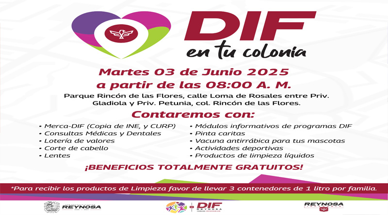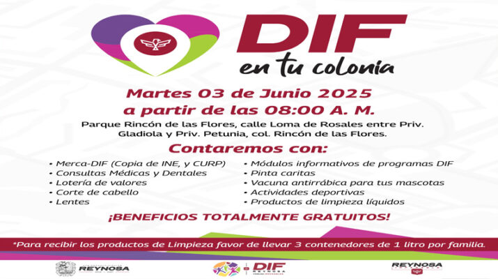 Para acercar los programas y servicios gratuitos a las familias, el Sistema DIF-Reynosa, que encabeza Carlos Luis Peña Garza, llevará la Brigada “DIF en Tu Colonia”, este próximo martes 3 de junio en el Parque Rincón de las Flores, ubicado en calle Loma de Rosales entre Privada Gladiola y Privada Petunia, en la colonia Rincón de las Flores, a partir de las 8:00 de la mañana.