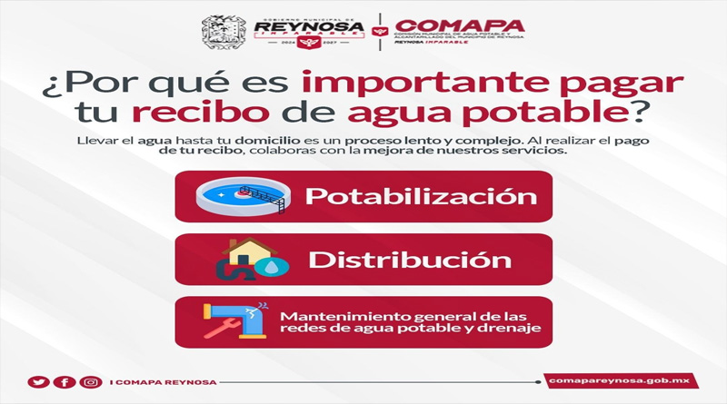 La Comisión Municipal de Agua Potable y Alcantarillado de Reynosa exhorta a la ciudadanía a efectuar su pago puntual del recibo de agua potable, ya que esta acción es clave para mantener y mejorar el servicio que llega a miles de hogares en la ciudad.