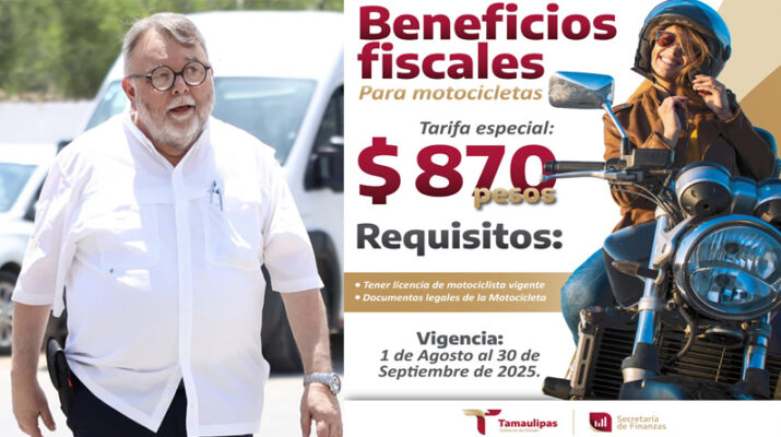 Ciudad Victoria, Tamaulipas.- Por instrucciones del gobernador Américo Villarreal Anaya, la Secretaría de Finanzas anunció un descuento del cien por ciento a todos los propietarios de motocicletas que tengan adeudos fiscales, aplicable a partir del 1 de agosto hasta el 30 de septiembre.