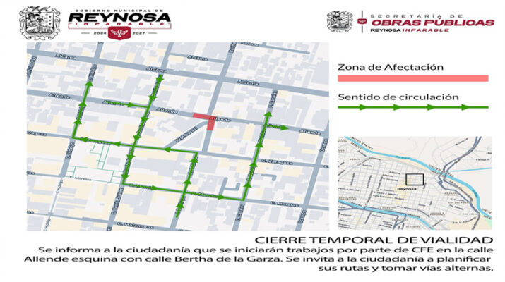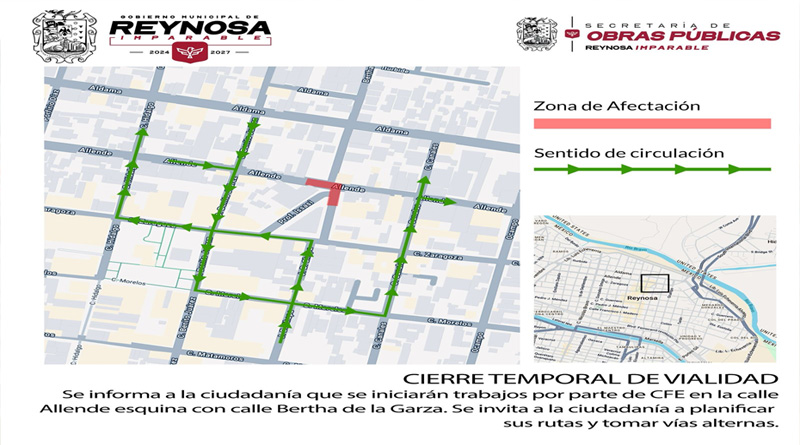 El Gobierno Municipal de Reynosa informa a los conductores que hoy lunes 4 de agosto se hizo un cierre temporal de vialidad en la esquina de las calles Allende y Bertha Garza.