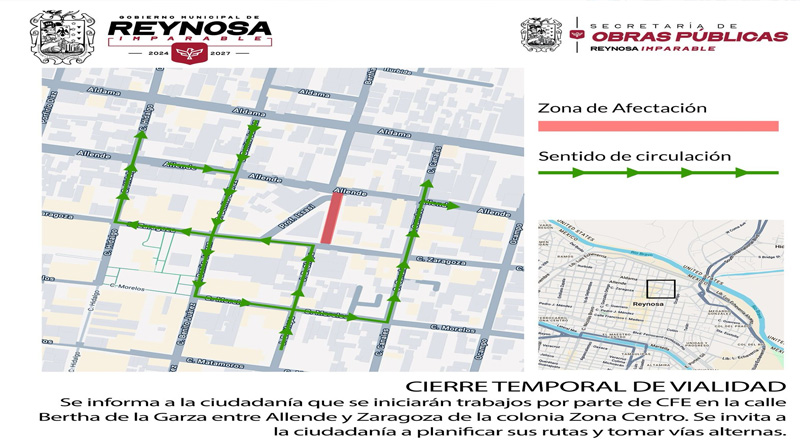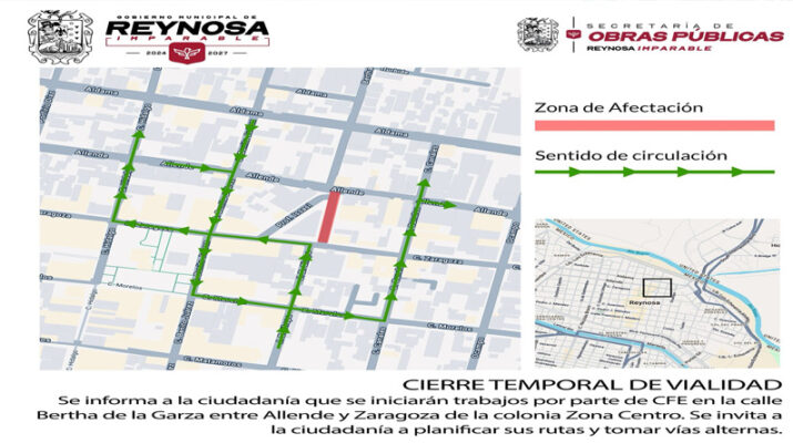 El Gobierno Municipal de Reynosa informa a la población que este jueves 14 de agosto la CFE realizará maniobras en la calle Bertha Garza, entre Allende y Zaragoza, así como en la calle Issasi, de la Zona Centro.