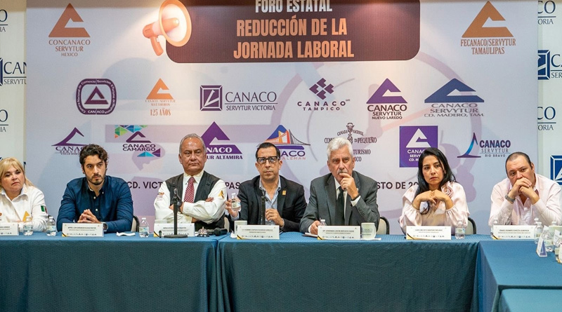 Ciudad Victoria, Tamaulipas.- El secretario del Trabajo y Previsión Social de Tamaulipas, Luis Gerardo Illoldi Reyes, participó en el Foro Estatal sobre la Reducción de la Jornada Laboral, realizado en las instalaciones de la Cámara Nacional de Comercio (Canaco) de Victoria, donde se abordaron los retos y oportunidades de esta iniciativa para el sector productivo y la fuerza laboral del estado.