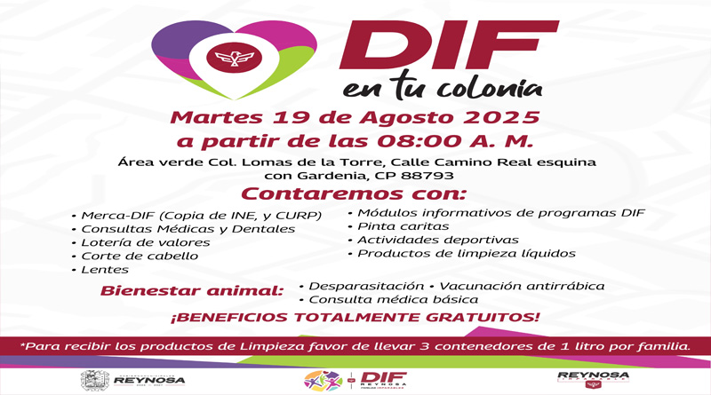 El Sistema DIF-Reynosa, que preside Carlos Luis Peña Garza, invita a las familias de la colonia Lomas de la Torre y sectores aledaños a participar en la Brigada “DIF en Tu Colonia”, que se realizará este martes 19 de agosto, a partir de las 8:00 de la mañana, en el área verde ubicada en calle Camino Real esquina con Gardenia.