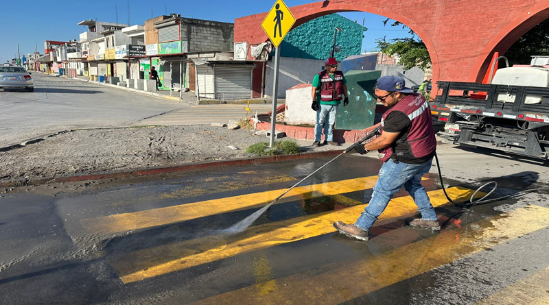 El saneamiento de Reynosa es integral, y esta mañana, por instrucciones del Alcalde Carlos Peña Ortiz, cuadrillas de Servicios Públicos trabajan en la limpieza de la Avenida Otoño, en Villas de Imaq.