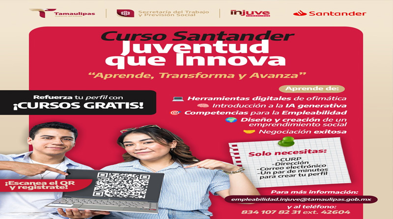 Ciudad Victoria, Tamaulipas.- El Instituto de la Juventud de Tamaulipas (INJUVE) y Banco Santander México, firmaron un acuerdo de colaboración con el fin de beneficiar a las y los jóvenes en el desarrollo de las habilidades más demandadas en el mercado laboral.