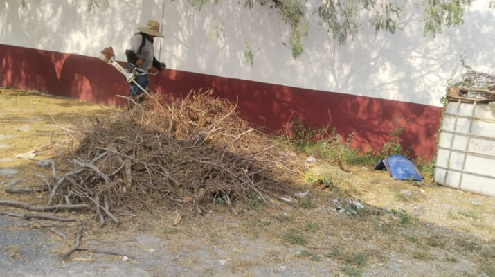Este día, sábado 6 de septiembre cuadrillas del R. Ayuntamiento trabajan en la limpieza, chapoleo y saneamiento del kínder Elizabeth Galván de Lozano de la colonia Jesús Vega Sanchez.
