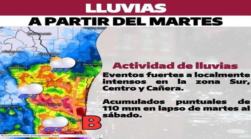 Ciudad Victoria, Tamaulipas .- La Coordinación Estatal de Protección Civil informa, que derivado de una zona de inestabilidad tropical procedente del Golfo de México, ocasionará un periodo de lluvias en el estado de Tamaulipas durante el periodo comprendido del martes 7 al sábado 11 de octubre de 2025, según lo dio a conocer el titular de la dependencia Luis Gerardo González de la Fuente.