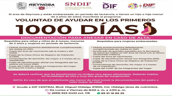 Con el propósito de continuar impulsando el bienestar de las familias y apoyar a mujeres embarazadas, así como a niñas y niños en sus primeros años de vida, el Sistema DIF-Reynosa invita a inscribirse al programa “Voluntad de Ayudar en los Primeros 1000 Días”, una iniciativa que promueve la buena nutrición y el desarrollo saludable durante las etapas más importantes de crecimiento.