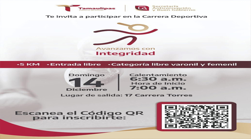 Ciudad Victoria, Tamaulipas.- Como parte de las actividades conmemorativas de la Semana Internacional contra la Corrupción, que se conmemora el próximo mes de diciembre, la Secretaría Anticorrupción y Buen Gobierno del Estado de Tamaulipas, invita a la ciudadanía, personas servidoras públicas y comunidad estudiantil a sumarse a la carrera “Avanzamos con Integridad”, que se llevará a cabo el próximo domingo 14 de diciembre.