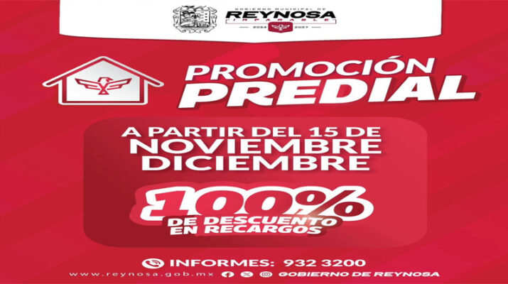 El Gobierno del Presidente Carlos Peña Ortiz ofrece la promoción en el Impuesto Predial, del 100% de condonación de recargos durante noviembre y diciembre, descuento que puede ser obtenido en las cajas de Finanzas y Tesorería, oficinas foráneas de COMAPA, cajeros automáticos del Ayuntamiento y página web del Municipio.