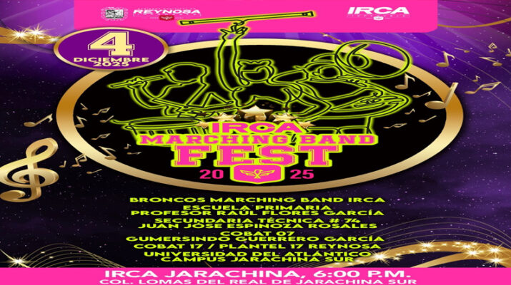 El Gobierno de Reynosa, que preside el Alcalde Carlos Peña Ortiz, invita a la comunidad a disfrutar del IRCA Marching Band Fest 2025, un evento que mostrará la energía y el talento de la Broncos Marching Band, junto con agrupaciones escolares invitadas.